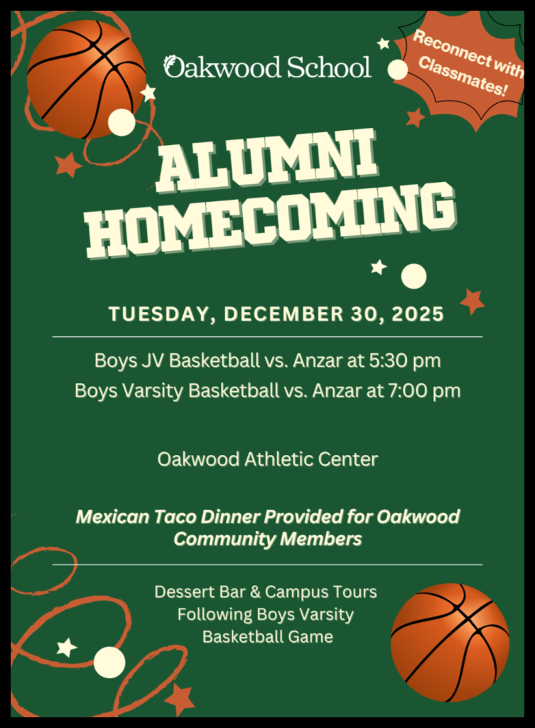 On Saturday, January 4, 2025, Oakwood School proudly hosted its 3rd Annual Alumni Homecoming event, and what a night it was! The event brought together 42 graduates from the classes of 2009 to 2024, creating a lively and heartwarming celebration of the Oakwood spirit.